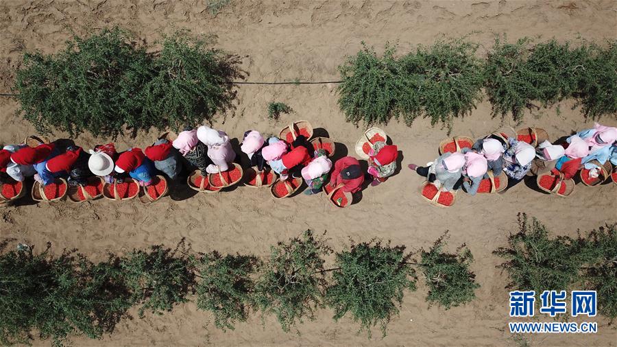 紅寺堡生態(tài)移民區(qū)的移民在百瑞源枸杞種植基地采摘頭茬枸杞(5月30日無人機拍攝)。近日,在寧夏吳忠市紅寺堡區(qū)百瑞源枸杞種植基地,頭茬枸杞迎來采摘收獲季。今年頭茬枸杞采摘期比往年提前20天左右。據(jù)了解,該基地地處紅寺堡生態(tài)移民區(qū),占地3000畝,采摘季節(jié)每天有數(shù)百名當(dāng)?shù)匾泼裨谔镩g采摘勞作。新華社記者王鵬 攝