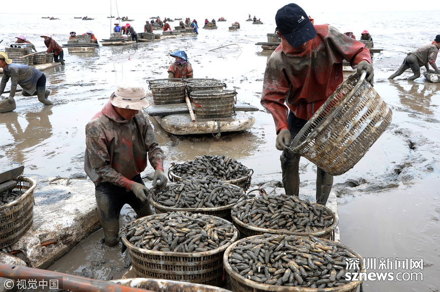 2018年5月30日,漁民們在江蘇連云港沿海地區(qū)海邊的灘涂上將剛收獲的海蟶運送上岸裝箱外運。