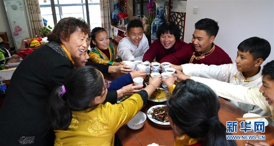 11月16日,南昌市第十七中學(xué)西藏班的學(xué)生來到劉和平(后排右四)家中吃飯。新華社記者 胡晨歡 攝