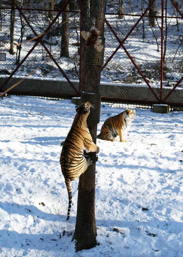 東北虎林園:老虎爬樹抓雞“顯身手”