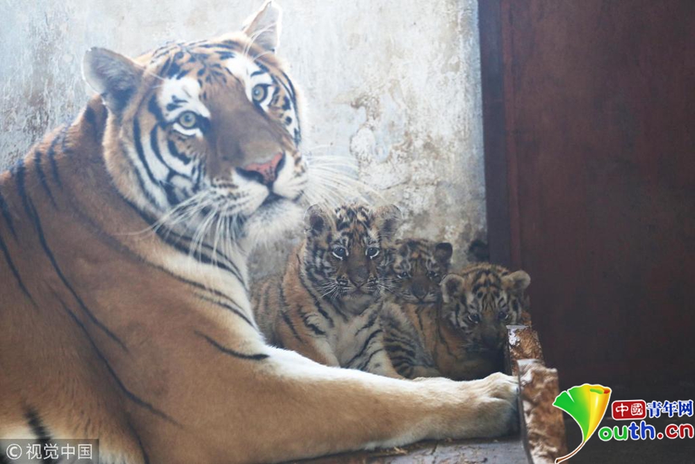 剛出生一個多月的小東北虎和“虎媽”在一起。