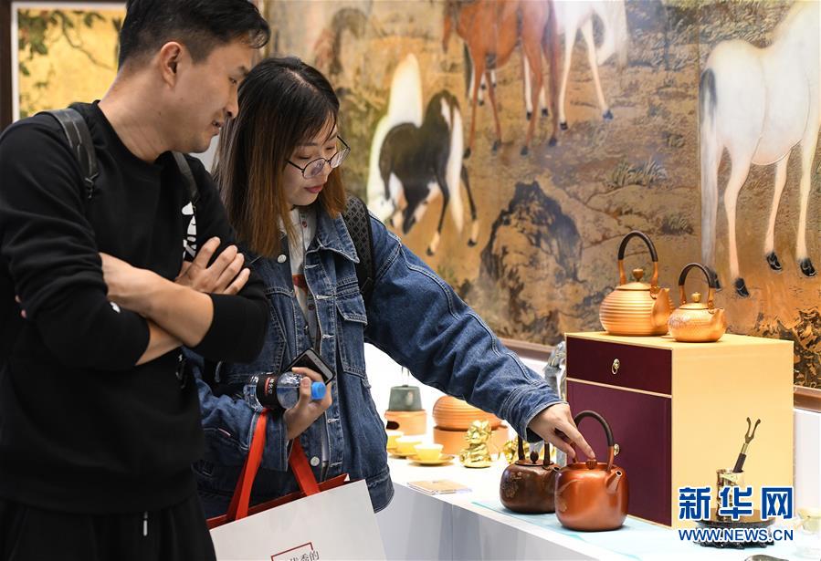 11月23日,兩位參觀者在“博博會”上觀看文創(chuàng)產(chǎn)品。新華社記者李賀攝