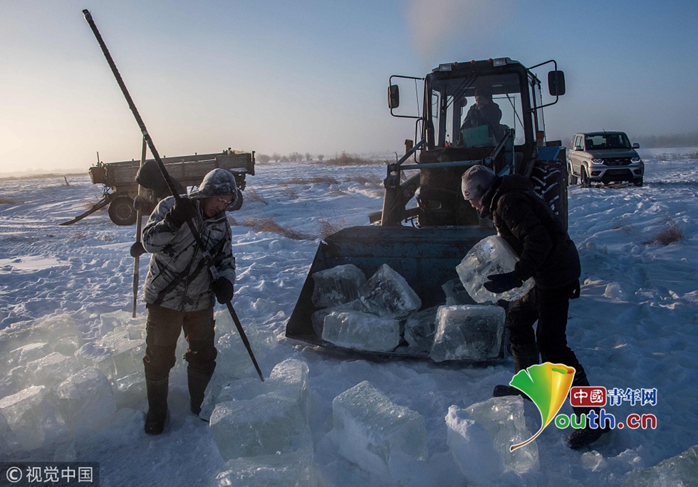 當(dāng)?shù)貢r間2018年11月27日,雅庫茨克,零下41攝氏度左右的氣溫下,村民在當(dāng)?shù)氐囊粋€湖中采集冰塊。當(dāng)?shù)睾芏嗳艘蕾囉谌诨鶋K解決供水,因為多年凍土覆蓋地區(qū)冬季氣溫極低,沒有其他的方式供應(yīng)水。