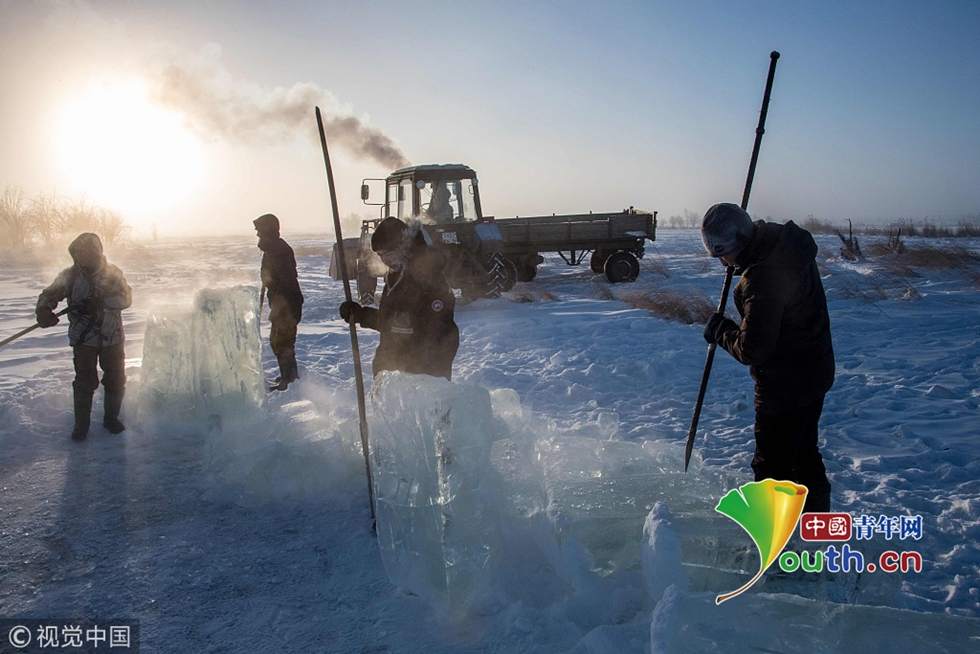 當?shù)貢r間2018年11月27日,雅庫茨克,零下41攝氏度左右的氣溫下,村民在當?shù)氐囊粋€湖中采集冰塊。當?shù)睾芏嗳艘蕾囉谌诨鶋K解決供水,因為多年凍土覆蓋地區(qū)冬季氣溫極低,沒有其他的方式供應(yīng)水。