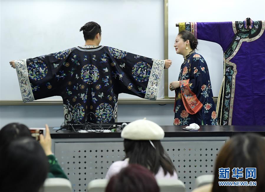 11月30日,在北京服裝學院,在畢紅(右)的邀請下,一名大學生試穿清代團花刺繡服裝。