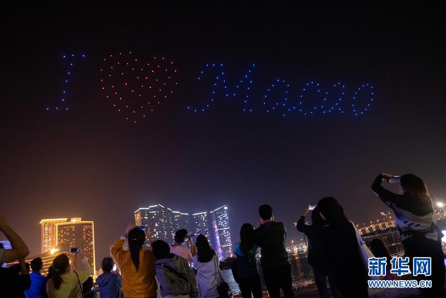 12月2日,無人機在澳門南灣湖水上活動中心進行空中圖案表演。 新華社記者 張金加 攝