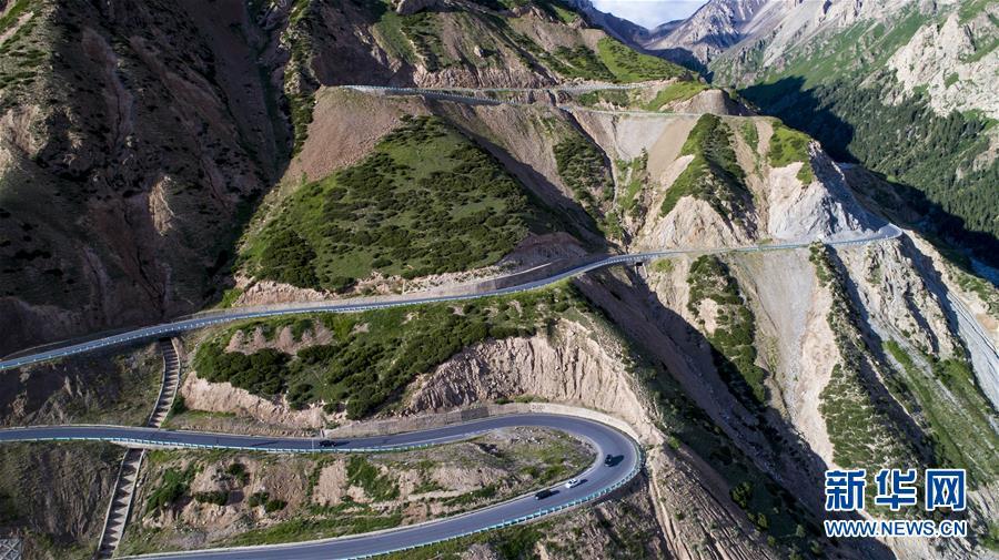 連續(xù)轉(zhuǎn)彎的獨庫公路盤山道(2017年7月15日無人機拍攝)。 新華社記者 江文耀 攝