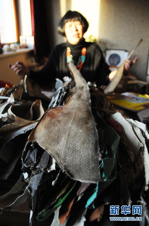 張琳的工作室堆滿了魚皮(2011年11月28日攝)。國(guó)家級(jí)非物質(zhì)文化遺產(chǎn)赫哲族魚皮制作技藝是我國(guó)赫哲族傳統(tǒng)手工藝術(shù)。作為這項(xiàng)技藝的黑龍江省級(jí)傳承人,十余年來(lái),張琳一直從事魚皮畫的研究和創(chuàng)作,并通過(guò)做推廣、開(kāi)講座、辦活動(dòng),讓更多年輕人了解并喜歡上這一傳統(tǒng)手工藝,將這項(xiàng)瀕臨失傳的藝術(shù)更好地傳承下去。新華社記者 王凱 攝