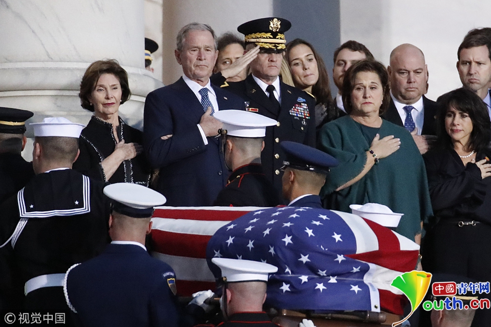 美國第41任總統(tǒng)喬治·赫伯特·沃克·布什(老布什)的靈柩從他的家鄉(xiāng)休斯頓運抵首都華盛頓市郊,他的遺體將從當(dāng)天晚上開始放于國會圓形大廳,供民眾瞻仰。