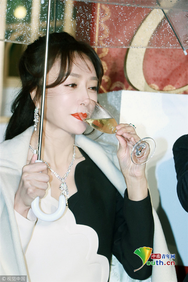 秦嵐撐傘雪膚紅唇美如畫 優(yōu)雅品香檳 ...