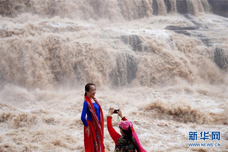 7月19日,游客在陜西境內(nèi)的壺口瀑布群前留影。 新華社記者陶明 攝