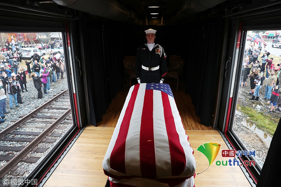 當(dāng)?shù)貢r(shí)間2018年12月6日,美國(guó)德州,美國(guó)前總統(tǒng)老布什將落葬德州農(nóng)機(jī)大學(xué)布什總統(tǒng)圖書(shū)館和博物館后面的布什家族墓地,與他半年前去世的妻子芭芭拉以及早夭的女兒蘿賓葬在一起。當(dāng)天,一輛葬禮專(zhuān)列將載著老布什的棺槨及其親朋,從休斯敦郊區(qū)開(kāi)往老布什的最后安葬之地、德州農(nóng)機(jī)大學(xué)。這列火車(chē)的第六節(jié)車(chē)廂側(cè)面是透明的,人們可以在鐵軌旁看到老布什蓋著國(guó)旗的靈樞。圖片作者:Joe Raedle/視覺(jué)中國(guó)
