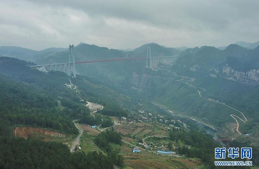 畢都高速公路北盤江大橋是杭瑞高速公路畢都段的控制性工程,位于貴州省和云南省交界處,由貴州省和云南省共建。該橋橋面至江面高差達(dá)565米,成為目前世界第一高橋。主橋?yàn)殇撹炝盒崩瓨颍骺?20米,目前位居同類型橋梁2016年12月29日正式通車。