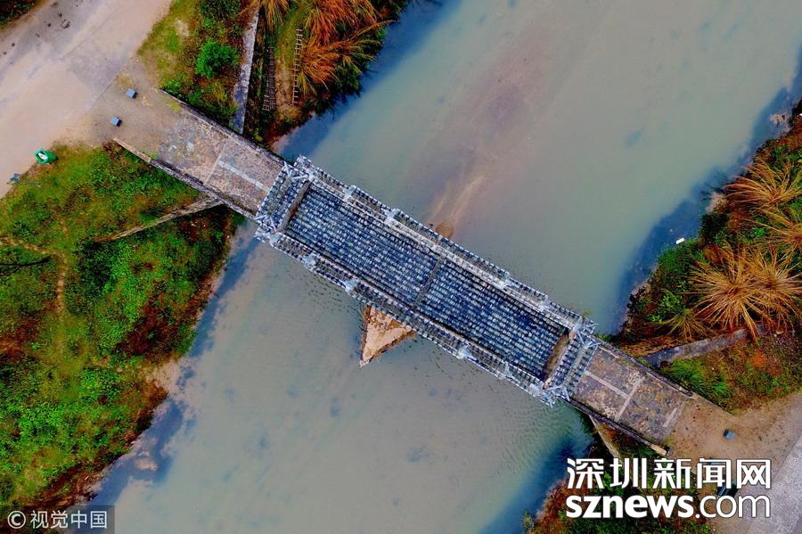 2018年12月9日,航拍位于江西省最南端龍南縣境內(nèi)的太平橋,游客行走在石拱橋上。