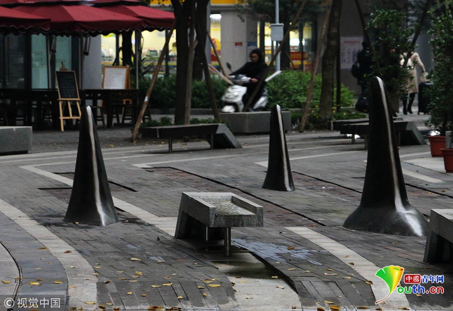 2018年11月20日,重慶一園區(qū)內(nèi)馬路中間突出一排“鯊魚鰭”,司機(jī)路人都被“嚇懵”了。突出的鯊魚鰭將兩側(cè)的車行道分開(kāi),原來(lái),這是為了進(jìn)一步保證車流的有序進(jìn)出和行人過(guò)街安全,同時(shí)也為了防止亂停車占用人行道,設(shè)置了這種異形“隔離樁”。圖片來(lái)源:視覺(jué)中國(guó)