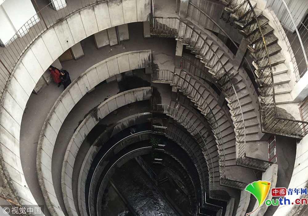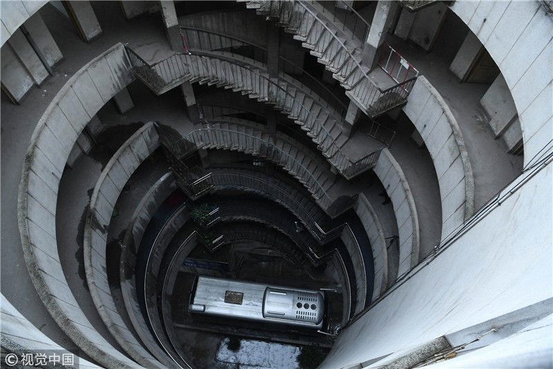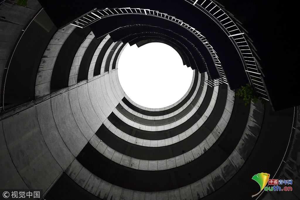 2017年9月27日,重慶,南岸區(qū)某小區(qū)的“螺旋”停車場,從公路到車庫要下5層樓,司機需要轉(zhuǎn)無數(shù)個360度圈。圖片來源:視覺中國