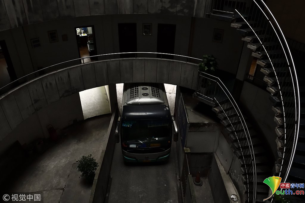 2018年12月6日,重慶江北紅旗河溝汽車站內(nèi),有一棟獨特的八層圓環(huán)狀建筑,底層每天有不少進出站的客車通行。據(jù)悉,這棟樓建于1990年,曾經(jīng)是車站旅館,如今一、二兩層用于車站辦公,其余樓層已廢棄。為確保安全,三層以上已經(jīng)被封鎖。圖為公交車穿過8層空心圓筒樓。徐勇/視覺中國