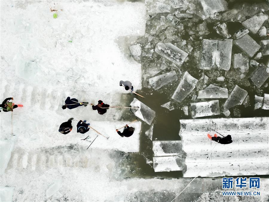 在松花江哈爾濱段江面,工人們?cè)谶M(jìn)行切割和采冰工作(12月12日無人機(jī)拍攝)。 黑龍江哈爾濱市的冰雪主題樂園哈爾濱冰雪大世界的采冰和建設(shè)工作近日拉開帷幕。為保證足夠的優(yōu)質(zhì)冰供給,每天有近千名采冰人和700多輛運(yùn)冰車參與到采冰工作。 新華社記者 王松 攝