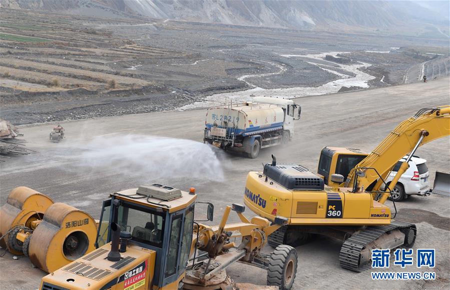 12月15日,一輛灑水車在中鐵上海局集團(tuán)公司施工的東格高速公路土建項(xiàng)目工地進(jìn)行灑水降塵作業(yè)。新華社記者楊宗友攝