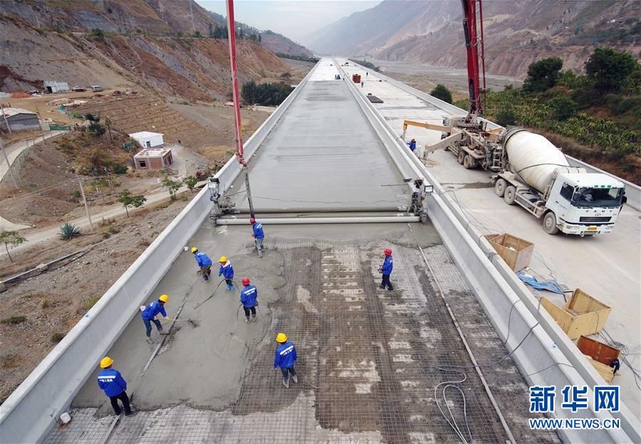 12月15日,中鐵上海局集團公司的施工人員在東格高速公路土建項目中進行橋面鋪裝作業(yè)(無人機拍攝)。 新華社記者楊宗友攝