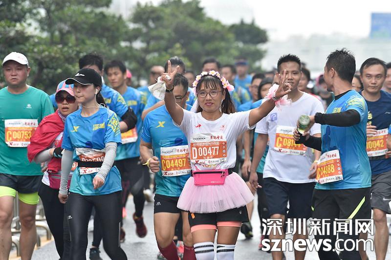 2018年12月16日,深圳國際馬拉松位于后海的折返點(diǎn),一名著女式短裙的選手正在向終點(diǎn)沖刺。