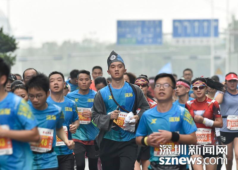 2018年12月16日,深圳國際馬拉松位于后海的折返點(diǎn),三名選手正在向終點(diǎn)沖刺,跟其他選手不同,其中兩位選手選擇了自己搭配服裝參賽。