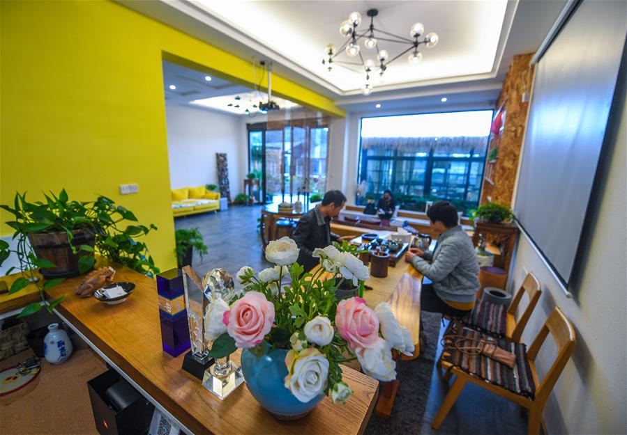 12月15日,客人在朱家尖烏石塘“漁夫客棧”民宿大廳喝茶。該民宿有海景房7間,餐飲包廂8個(gè)。 新華社記者 徐昱 攝