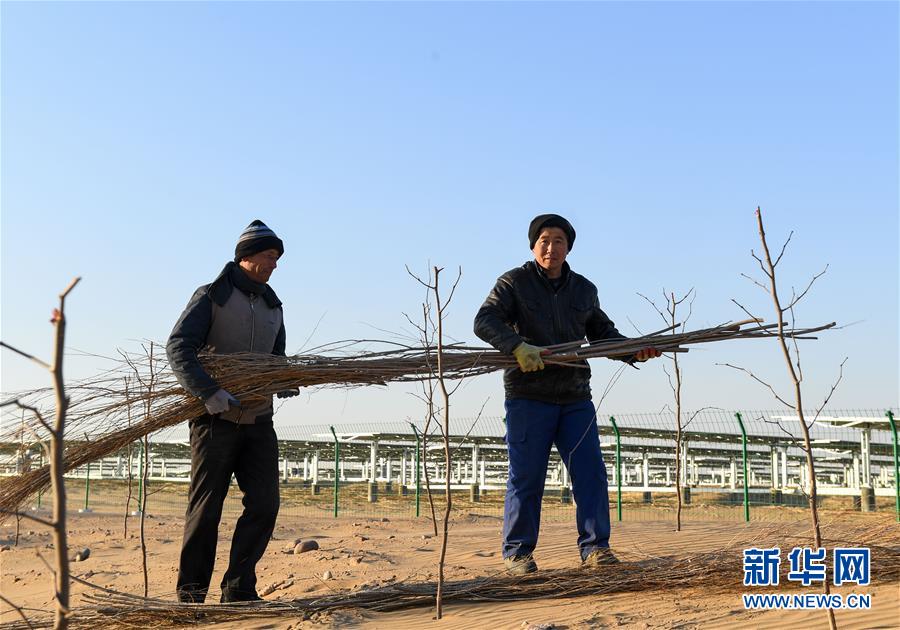 12月13日,位于庫布其沙漠腹地的達拉特光伏發(fā)電應用領(lǐng)跑基地一期500兆瓦項目中,工人用柳枝制作固沙帶。 新華社記者 彭源攝