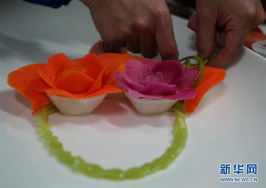 12月15日,工作人員在擺放選手們制作完成的菜品。