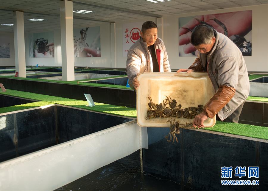 12月17日,在湖州市吳興區(qū)高新區(qū)廟港人千畝水產(chǎn)園,蟹農(nóng)將捕撈的大閘蟹投入暫養(yǎng)池,等待包裝。 新華社記者翁忻旸攝