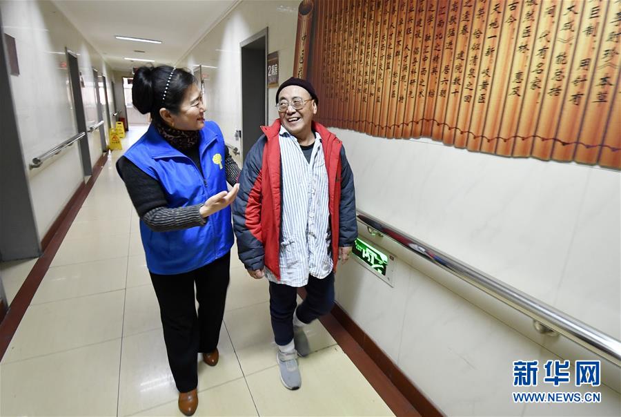12月17日,豐臺(tái)區(qū)長(zhǎng)辛店街道車輛廠社區(qū)養(yǎng)老服務(wù)驛站的員工陪同她們通過“連心通”救助的突發(fā)疾病獨(dú)居老人連鐵良(右)做康復(fù)。 新華社記者 李欣 攝