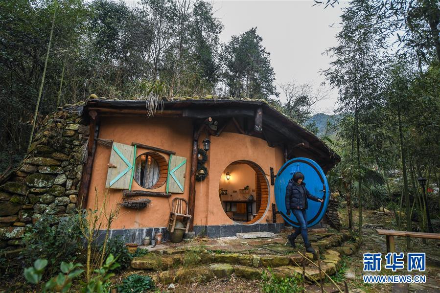 這是12月19日拍攝的民宿“僻地寒樓”的一間特色石頭屋。該民宿共有7幢風(fēng)格各異的小屋分布在山坡上,頗具特色。河橋鎮(zhèn)青年張雁辭去了上海的工作,回到家鄉(xiāng)開辦了這家民宿。  新華社記者 徐昱 攝