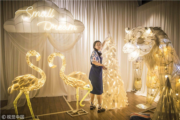 2018年5月6日,廣州,在天河區(qū)一家大商場辦個展時,用紙片做成的北極熊、大松樹、火烈鳥、紙房子在光線的配合下美輪美奐,吸引了很多顧客駐足?!皫缀趺總€人一看到,都會走進那個夢幻的場景里,和這些紙雕一起合影?!眻D片攝于2018年5月6日。南塘/視覺中國