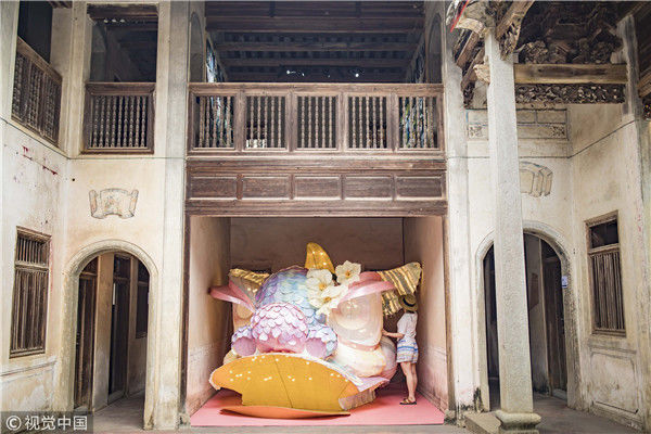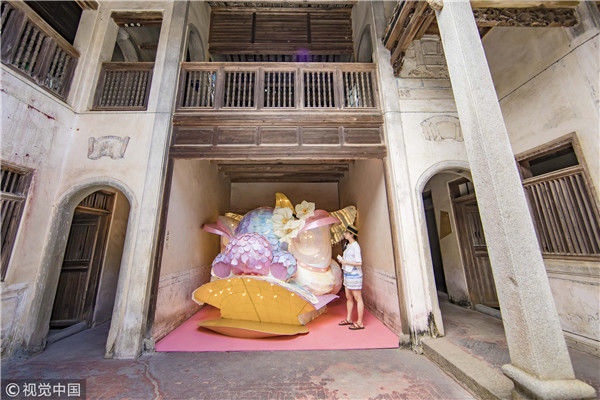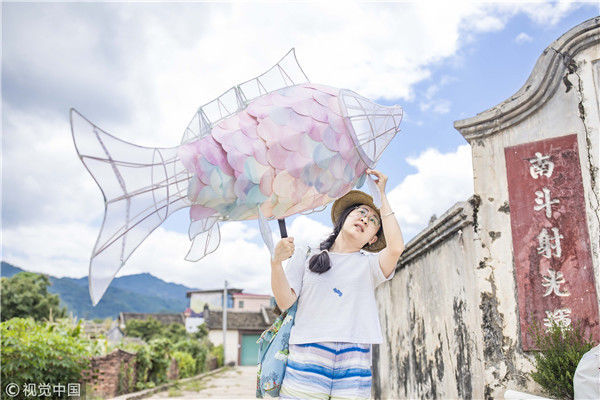 2018年8月10日,廣東揭陽,溫秋雯把獅子頭扒得只剩下骨架和包布,之后將不同顏色的紙片裁剪成三角形、鱗片形等不同形狀,作為裝飾獅子的皮毛,粘在獅子身上,獅子的鼻子則是用彩紙條以手鞠的方式纏繞而成,在獅頭內(nèi)部安裝了一盞白熾燈,一打開電燈,萌態(tài)可掬的獅子便呈現(xiàn)在人們眼前。紙片的顏色以淡粉、淡綠、淺白色為主,就這樣,人們平時印象中威猛的南獅,被改裝得萌萌的。圖為2018年8月10日,廣東省梅州市,溫秋雯和她的紙雕作品。