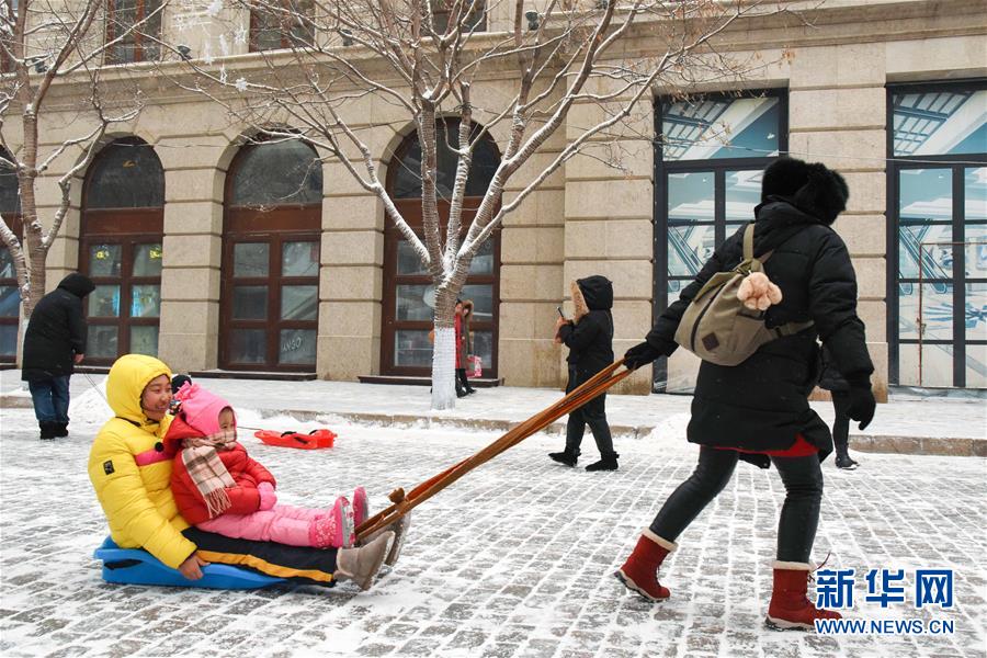 12月21日,游客在哈爾濱中央大街玩耍。當日,“冰城”哈爾濱迎來降雪天氣,整個城市變得銀裝素裹。新華社記者韓宇攝