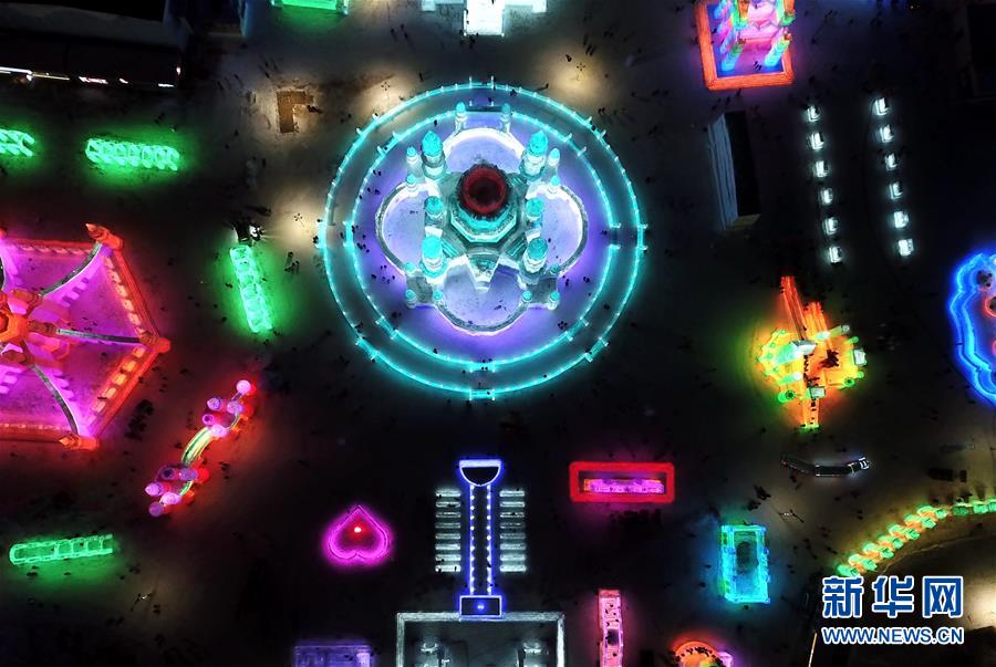 這是哈爾濱冰雪大世界園區(qū)內(nèi)的一處景觀(12月23日無(wú)人機(jī)拍攝)。