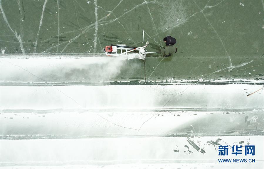 在松花江哈爾濱段江面,工人們?cè)谶M(jìn)行切割和采冰工作(12月12日無(wú)人機(jī)拍攝)。 黑龍江哈爾濱市的冰雪主題樂園哈爾濱冰雪大世界的采冰和建設(shè)工作近日拉開帷幕。為保證足夠的優(yōu)質(zhì)冰供給,每天有近千名采冰人和700多輛運(yùn)冰車參與到采冰工作。 新華社記者 王松 攝