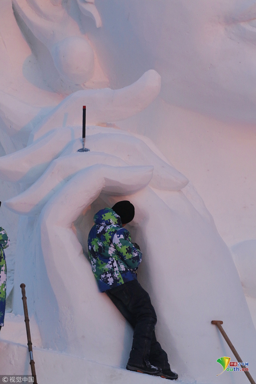 國(guó)內(nèi)最大的雪雕盛會(huì)太陽(yáng)島雪博會(huì)正在緊鑼密鼓建設(shè)中,雪雕師正在精雕細(xì)刻打磨中。