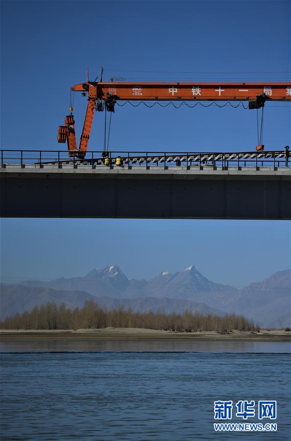 11月26日,施工人員在川藏鐵路拉林段貢嘎雅魯藏布江特大橋上鋪軌。 新華社記者 普布扎西 攝