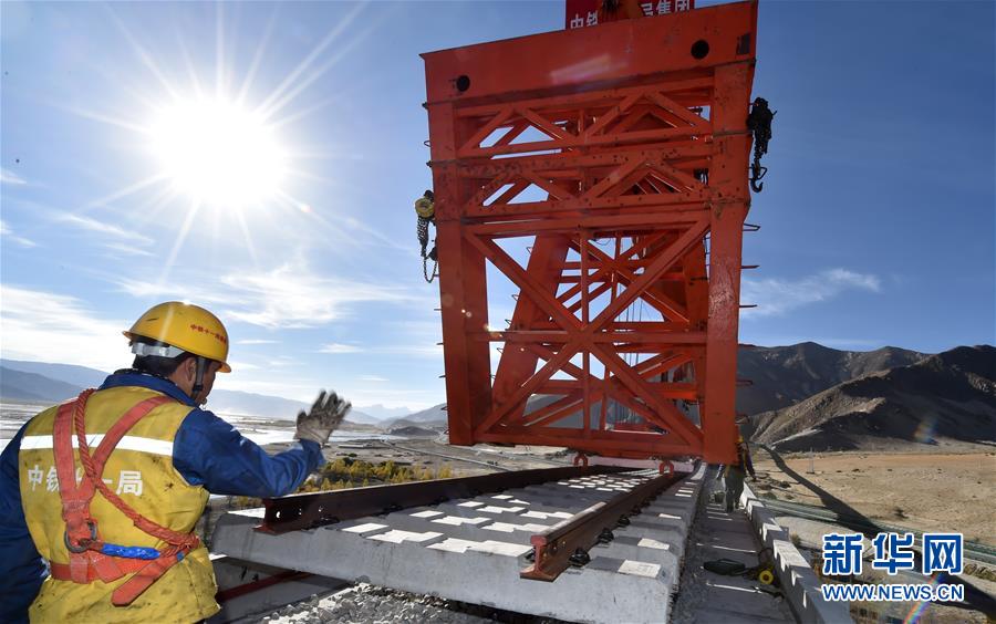 中鐵十一局的工人在川藏鐵路拉林段昌果特大橋進(jìn)行鋪軌作業(yè)(10月16日攝)。 近日,川藏鐵路拉薩至林芝段昌果特大橋開(kāi)始鋪設(shè)行軌排、架設(shè)梁片,標(biāo)志著川藏鐵路拉林段正式進(jìn)入鋪軌階段。 新華社記者 覺(jué)果 攝
