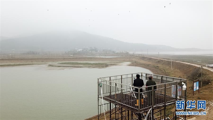 12月22日,王三益(左)在菜子湖濕地觀測(cè)候鳥(niǎo)(無(wú)人機(jī)拍攝)。 新華社記者 張端 攝