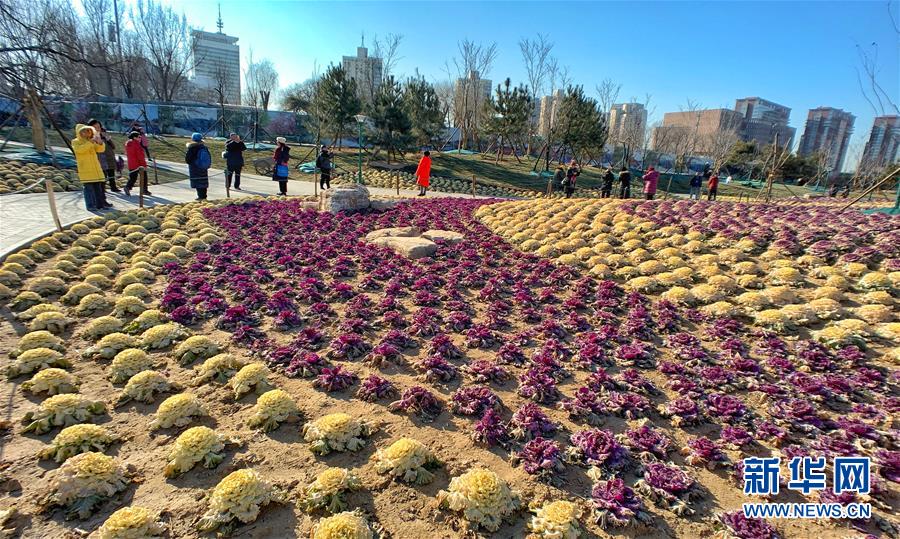 12月24日,游人在北京玉淵潭公園觀賞甘藍(lán)。 日前,北京市玉淵潭公園移栽的三萬多棵紫色和黃色羽衣甘藍(lán)盛開,為冬季公園增添了色彩。 新華社記者李欣攝