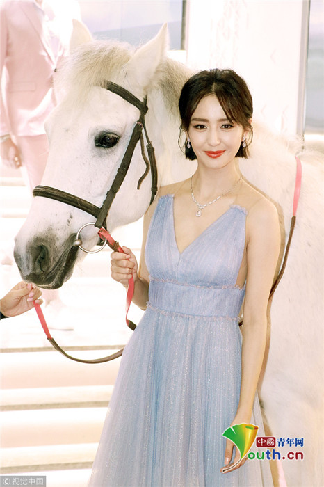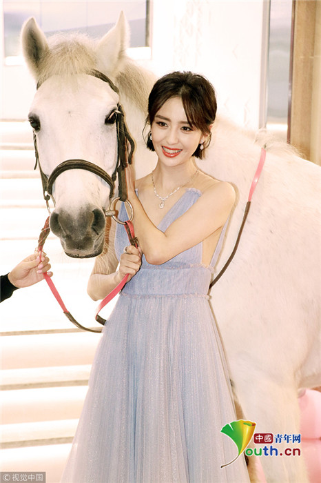 佟麗婭穿淡藍(lán)紗裙 與白馬合照甜美迷人仙氣十足