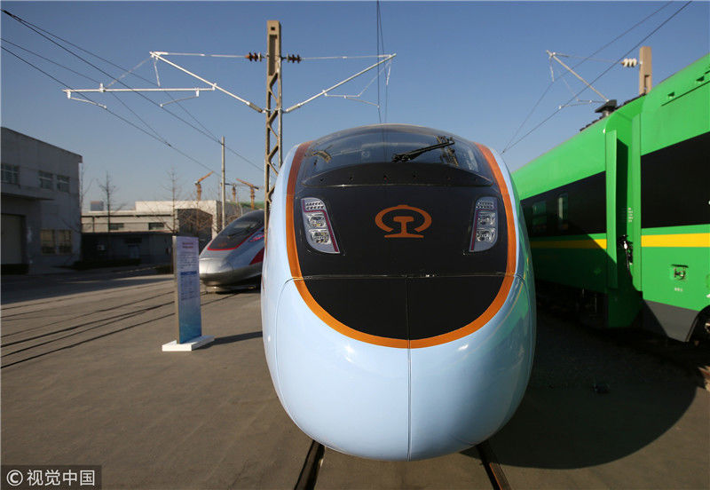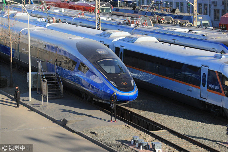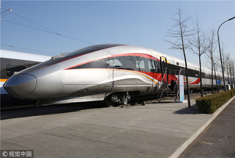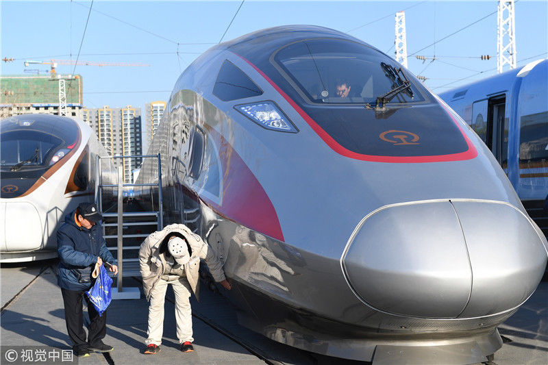 2018年12月24日,北京,中國(guó)鐵路科技創(chuàng)新成果展在國(guó)家鐵道試驗(yàn)中心舉行。新型復(fù)興號(hào)動(dòng)車組實(shí)車首次公開(kāi)亮相,現(xiàn)場(chǎng)體驗(yàn)乘車運(yùn)行。視覺(jué)中國(guó)