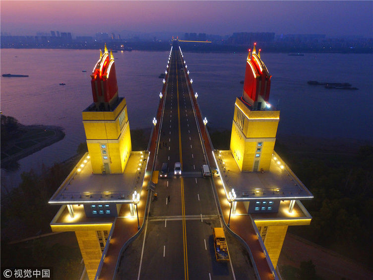 2018年12月13日,江蘇南京,“一橋飛架南北,天塹變通途?!弊鳛槲覈谝蛔孕性O計和建造的雙層鐵路、公路兩用橋,南京長江大橋在我國橋梁史上的重要地位不言而喻。從1968年建成后的48年間,它就如同一條巨龍,始終在長江上默默守護著人來車往。南京長江大橋上層是公路橋,下層為雙軌復線鐵路橋,連接津浦鐵路與滬寧鐵路干線,是我國南北交通要津和命脈。近年來,由于南京長江大橋公路橋的實際通行荷載遠超原先設計標準,不僅橋面上擁堵常現,橋梁本身的種種“病害”也日益加深。圖為2018年12月13日,夜幕降臨,南京長江大橋歸位后的玉蘭花燈重新點亮。大橋玉蘭花燈柱共有299根,每根燈柱上有5盞玉蘭花燈,1大4小,一共1495盞。方東旭/視覺中國