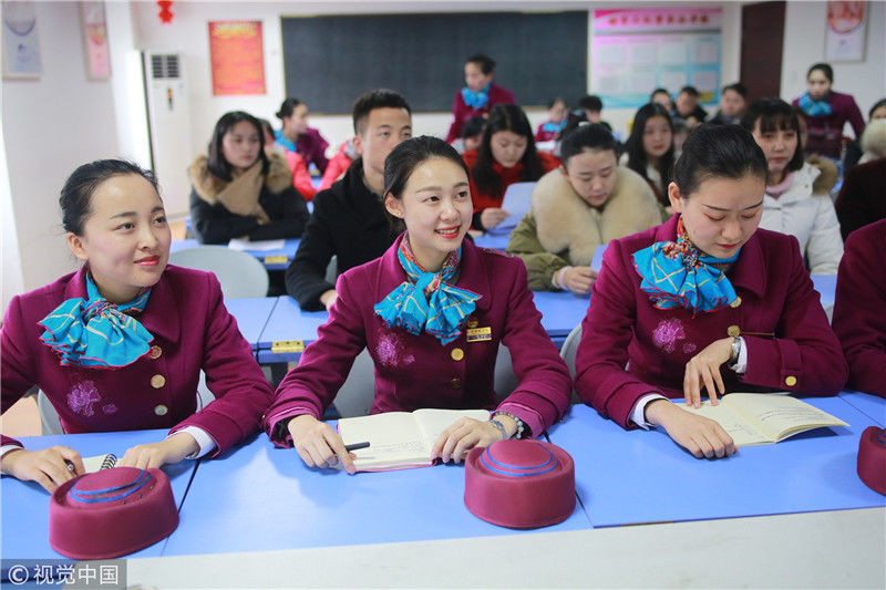 2018年12月27日,四川成都,為備戰(zhàn)即將開通的成雅鐵路,中國鐵路成都局集團有限公司成都客運段動車二隊對成雅動車的乘務(wù)人員進行理論、形體、服務(wù)禮儀等內(nèi)容的培訓。