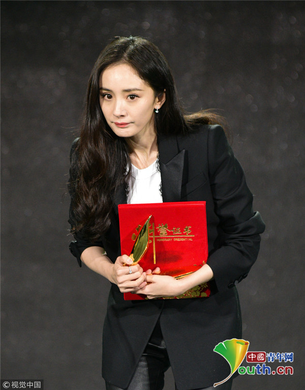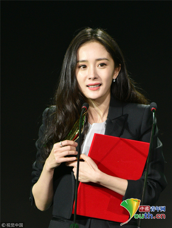 楊冪上臺領(lǐng)獎西裝精致干練 談話間舉手顯呆萌