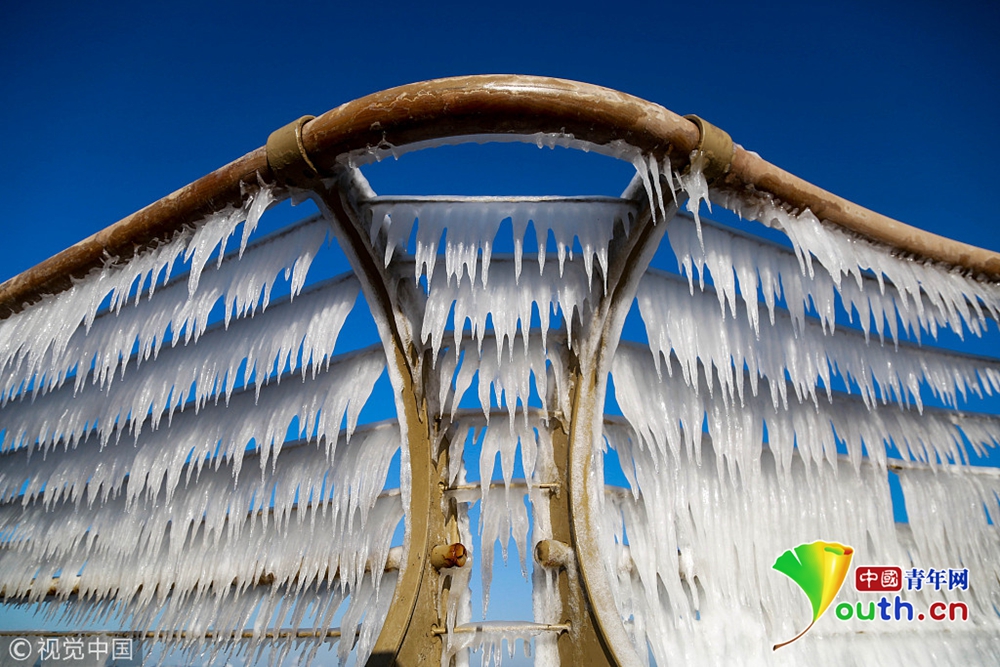 2018年12月29日,大連市迎來(lái)入冬以來(lái)最冷-12℃的低溫,在大風(fēng)和潮汐的作用下,海水在岸邊的護(hù)欄上瞬間凝固,凝結(jié)并形成大面積形狀各異的冰凌,在延綿5公里的木棧道上形成奇特的冰凌奇觀(guān)。