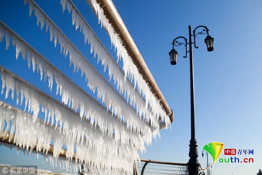 2018年12月29日,大連,晶瑩剔透的冰凌錯落有致的懸掛在東港海岸的木棧道護欄上,美輪美奐,形成了一道“風雕冰琢”的風景。
