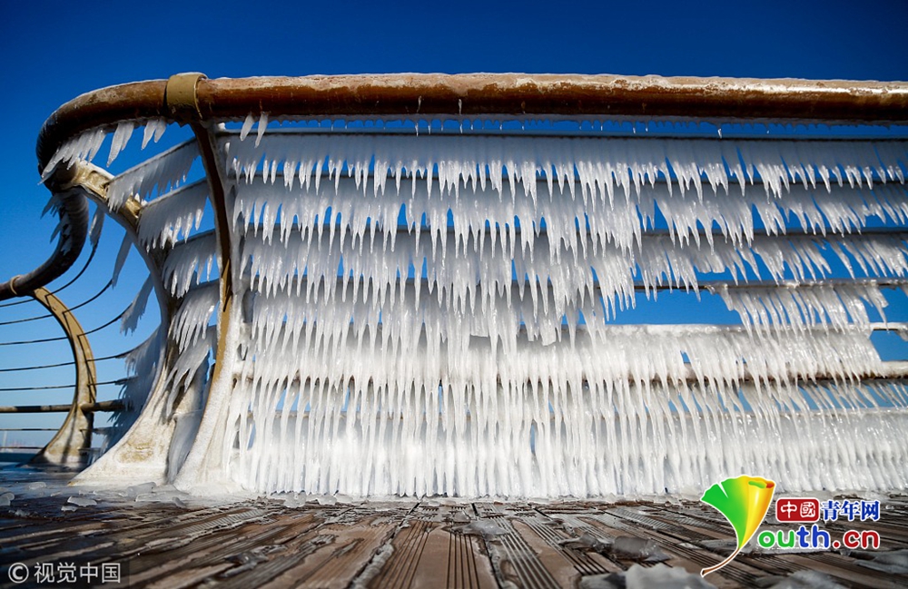 晶瑩剔透的冰凌錯(cuò)落有致的懸掛在東港海岸的木棧道護(hù)欄上。